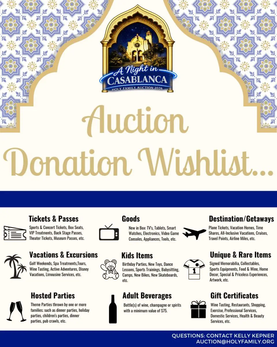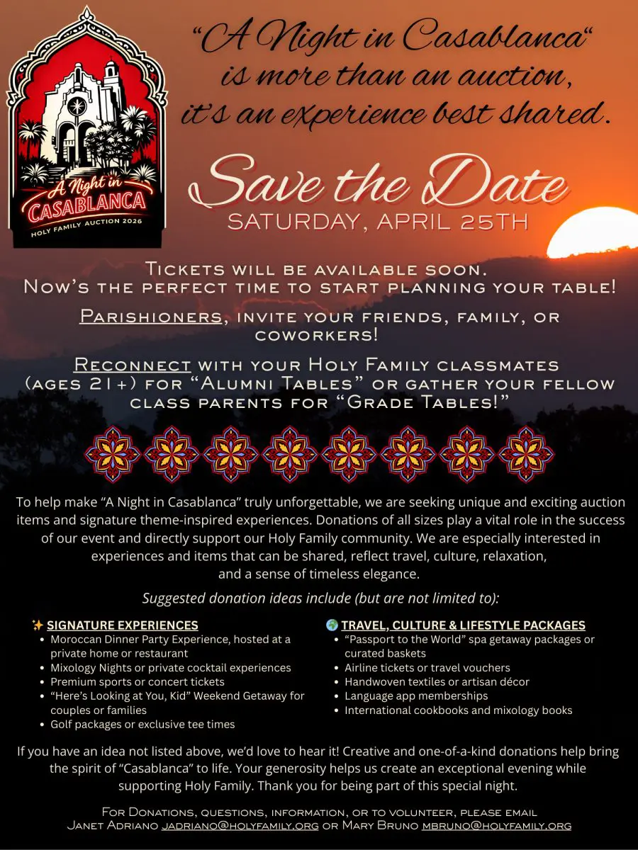 For Donations, Questions, Information, or to volunteer, please email Janet Adriano at jadriano@holyfamily.org or Mary Bruno at mbruno@holyfamily.org.