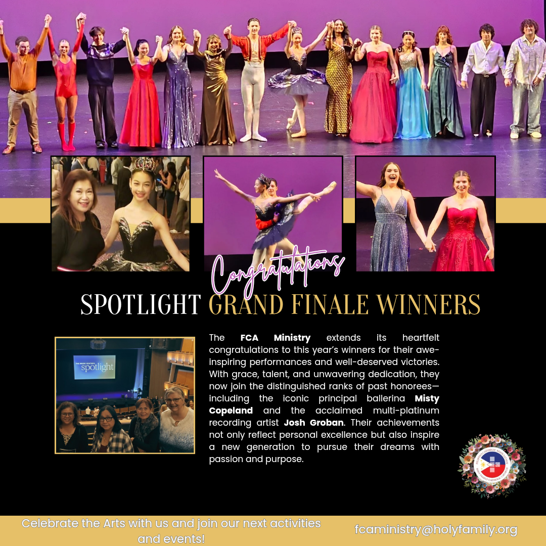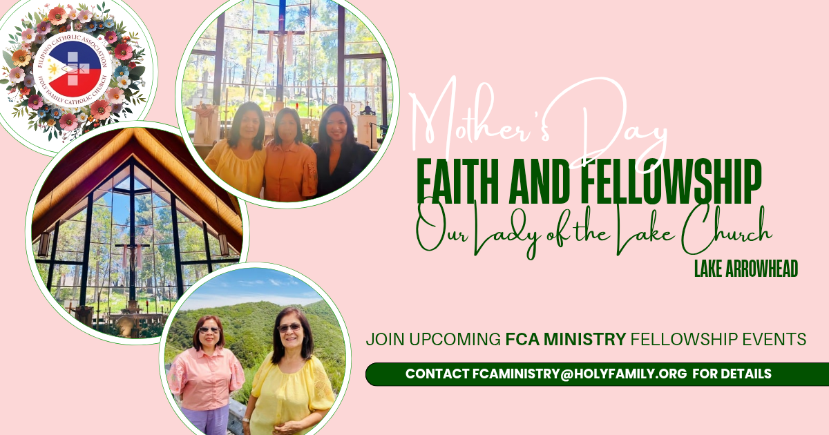 The mission of the Filipino-American Catholic Association (FCA) Ministry is to preserve and celebrate Filipino culture for future generations, foster fellowship, and uplift one another through prayer. We are dedicated to supporting our community with compassion and unity, and we warmly welcome individuals of all backgrounds to join us in embracing our traditions, values, and spirit of togetherness.